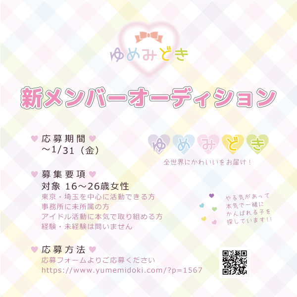 Newsゆめみどき4期生オーディション1/31(金)まで ゆめみどきメンバーとして、4期生のオーディションを行います。 一次審査(書類)こちらのフォームから応募 ↓ 二次審査(面談)一次審査合格者のみご連絡いたします ↓ 合格後すぐに研修生として活動をはじめていただきます (登録料、レッスン費、衣装代など一切かかりません。交通費は全額支給) 投稿ナビゲーション 1/25(土)羽風有紗@ジールシアター新宿【SOLDOUT】1/22(水)紫月りかリクエスト撮影会
